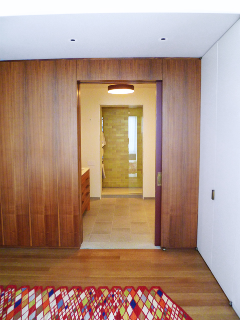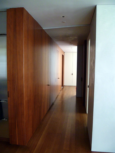 An apartment renovation for a married couple. Roughly 1500 SF in size, the primary design goals were to A) organize layout by providing a clear central corridor from which all spaces branch out, and B) balance the coldness and rigidity of the existing aluminum windows with abundant wood paneling and detailing (especially at the kitchen). The result is an apartment which feels expansive yet intimate. The primarily northern light brings out the subtleties in the wood grain, the sheen in the kitchen tiles, and the gentle patina of the bronze hardware. Also new mechanical system and rerouted plumbing.