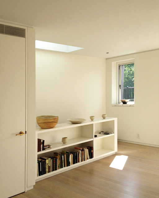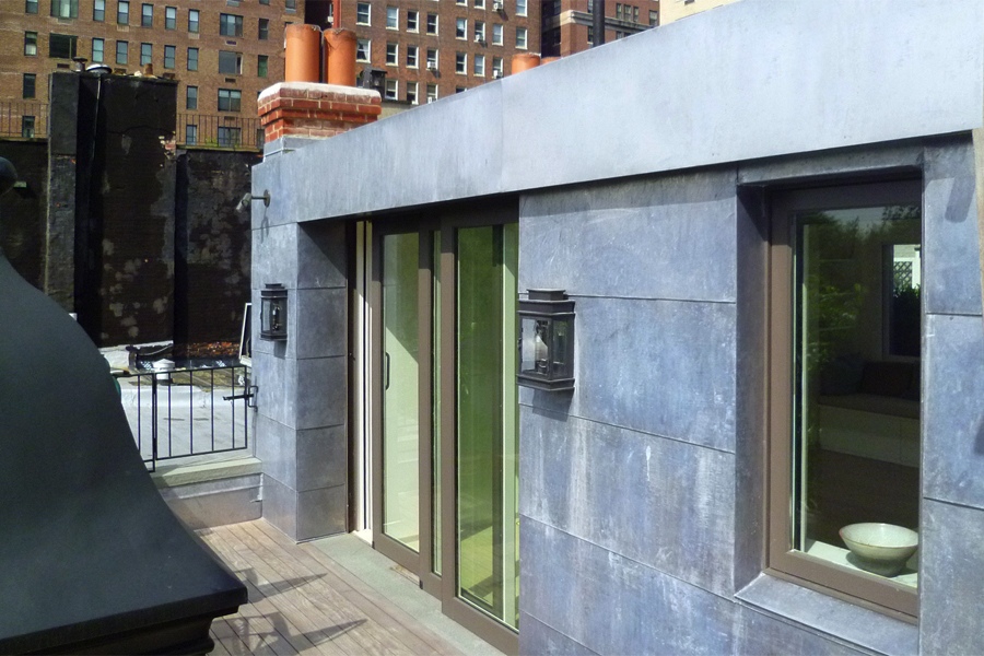 A penthouse addition atop a historic townhouse on the Upper East Side, for a photographer client. Hardly 500 SF in size, the addition tucks all hardware, lighting, plumbing, and mechanical systems away and utilizes a variety of off-white finishes to create a soft, bright space which changes its tonality with the daylight. Exterior scope was very sensitive to the Landmarks Preservation Commission and included new lead-coated copper siding and flashing, ipe decking, metal railings, restoration of windows and turrets, and masonry repointing.