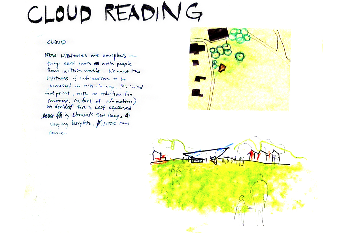 Cloud Reading takes inspiration from the current trend of cloud computing and data storage, and tries to give it a built form. Boxes containing books, periodicals, and other reading material are hung from a large inclined plane representing "the cloud." The plane is structurally supported by two simple bookshelves with pull-out tables which can receive visitors who wish to sit and read.