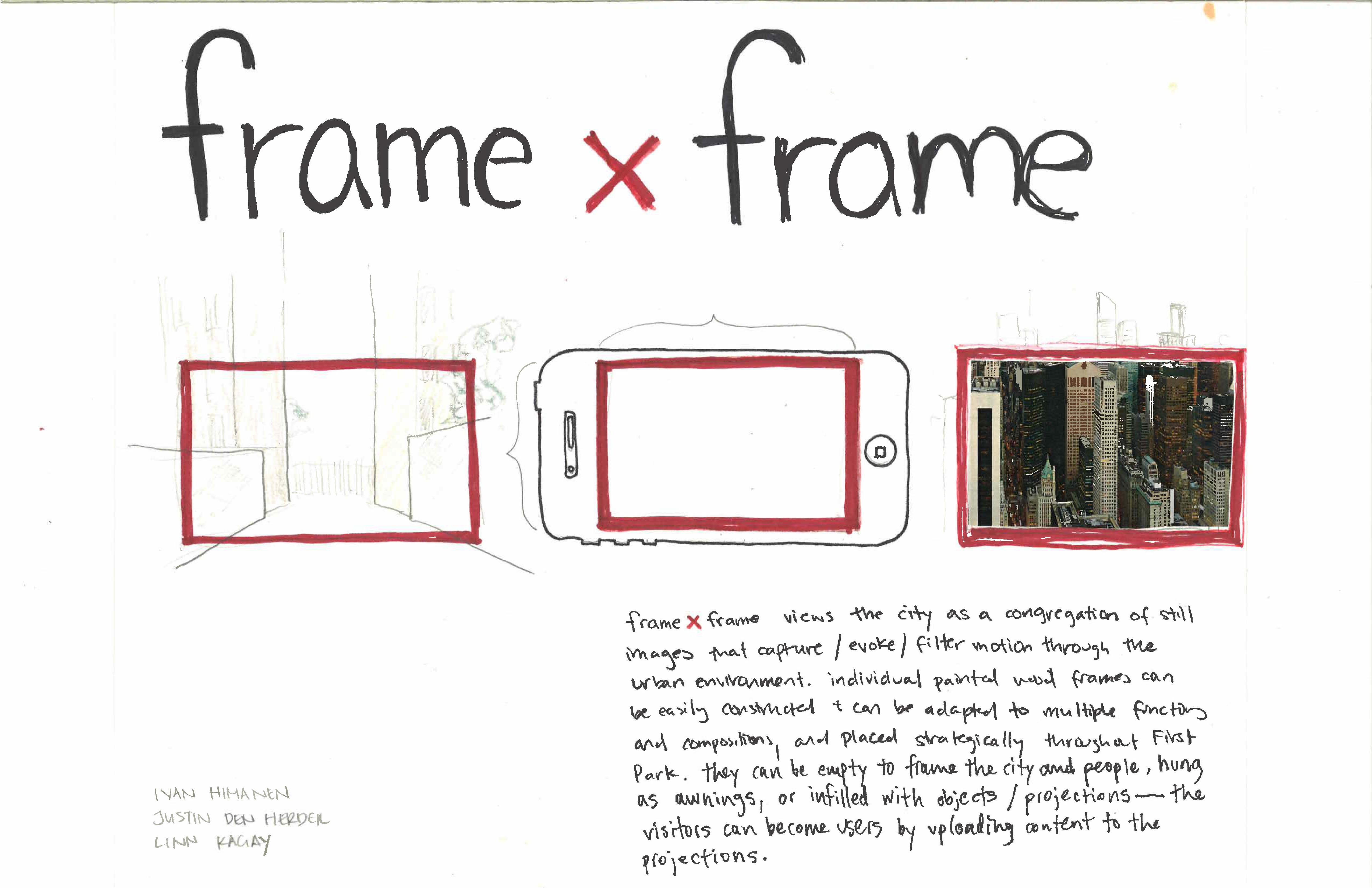 FRAME x FRAME views the city as a congregation of still images that capture / evoke / filter motion through the urban environment. It is loosely inspired by Bernard Tschumi's Pavilion at Parc de la Villette. Individual painted wood frames can be easily constructed and can be adapted to multiple functions and compositions, and placed strategically throughout First Park. They can be empty to frame the city and people, hung as awnings, or infilled with objects / projections — the visitors can become users by uploading content to the projections.