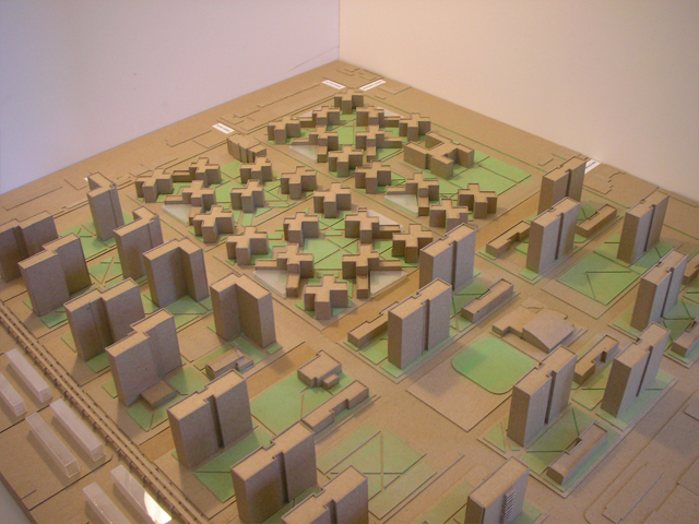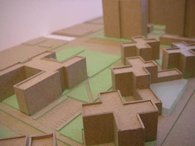 Site model constructed of chipboard, acrylic, and pastels.