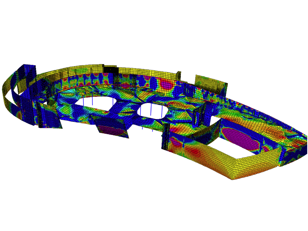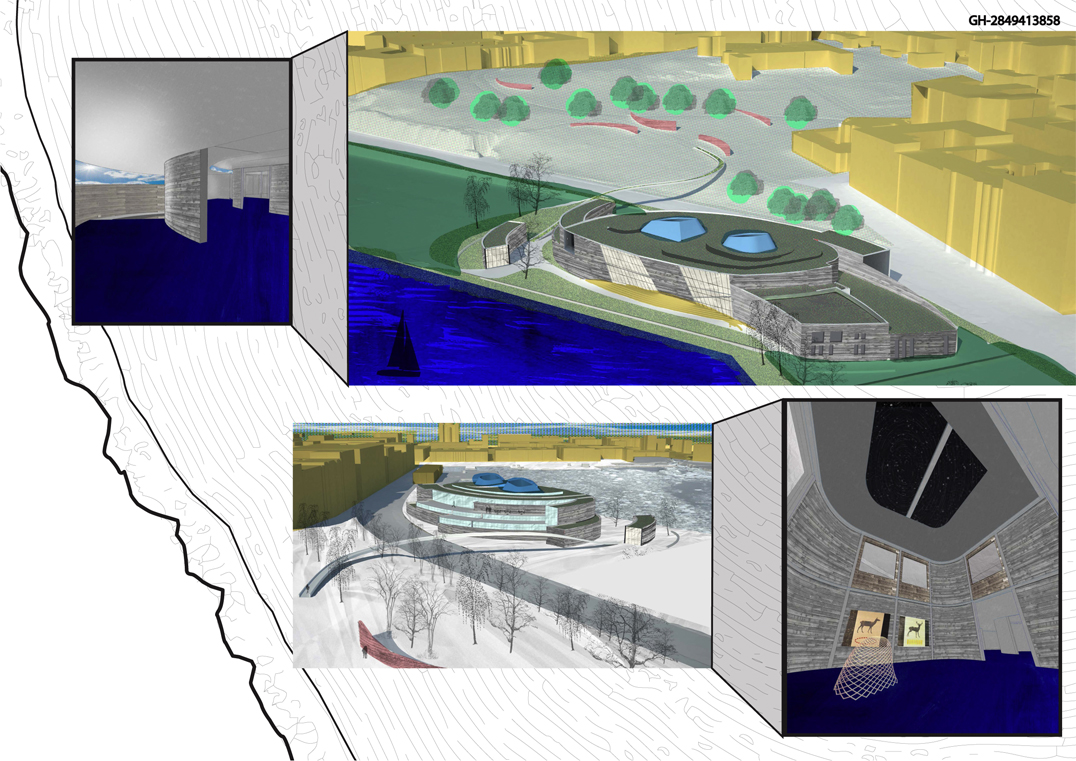 "The main gallery on the ground floor houses the root of the museum's collection: the permanent exhibition of Nordic design. The second level is an expansive space, open in plan to provide adaptability for a myriad of exhibit configurations; it is here that the temporary exhibits are installed. This level would be segregated by temporary partitions where light-transmitting paper is pressed between glass panes and set within wood frames in an arrangement best suited for each exhibit. Within both galleries are tall ceilings with exposed structure, concrete girders supporting timber beams in a circumferential arrangement, mimicking that of tree rings. Artwork is mounted on unpainted, woodpaneled walls. There is no paint on the walls save for that of the art itself. The galleries on both levels are punctured by two double-height atria performing as light-disseminating cores."