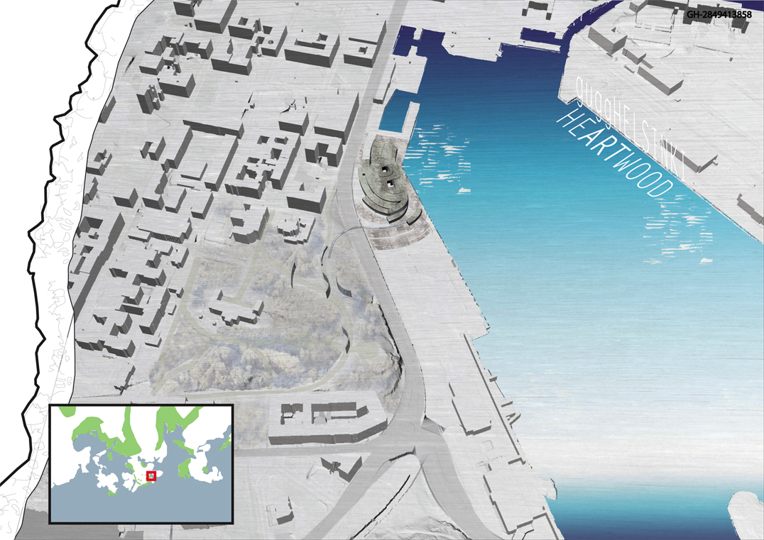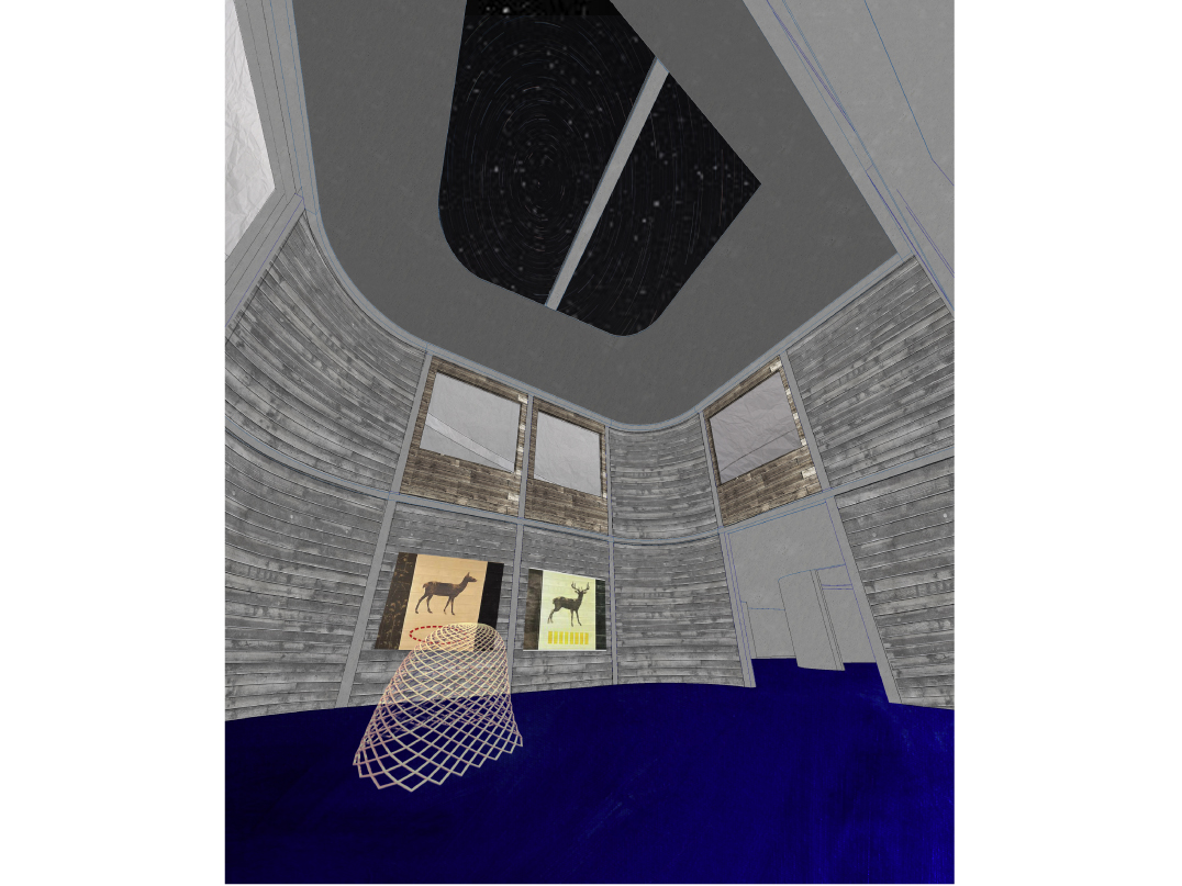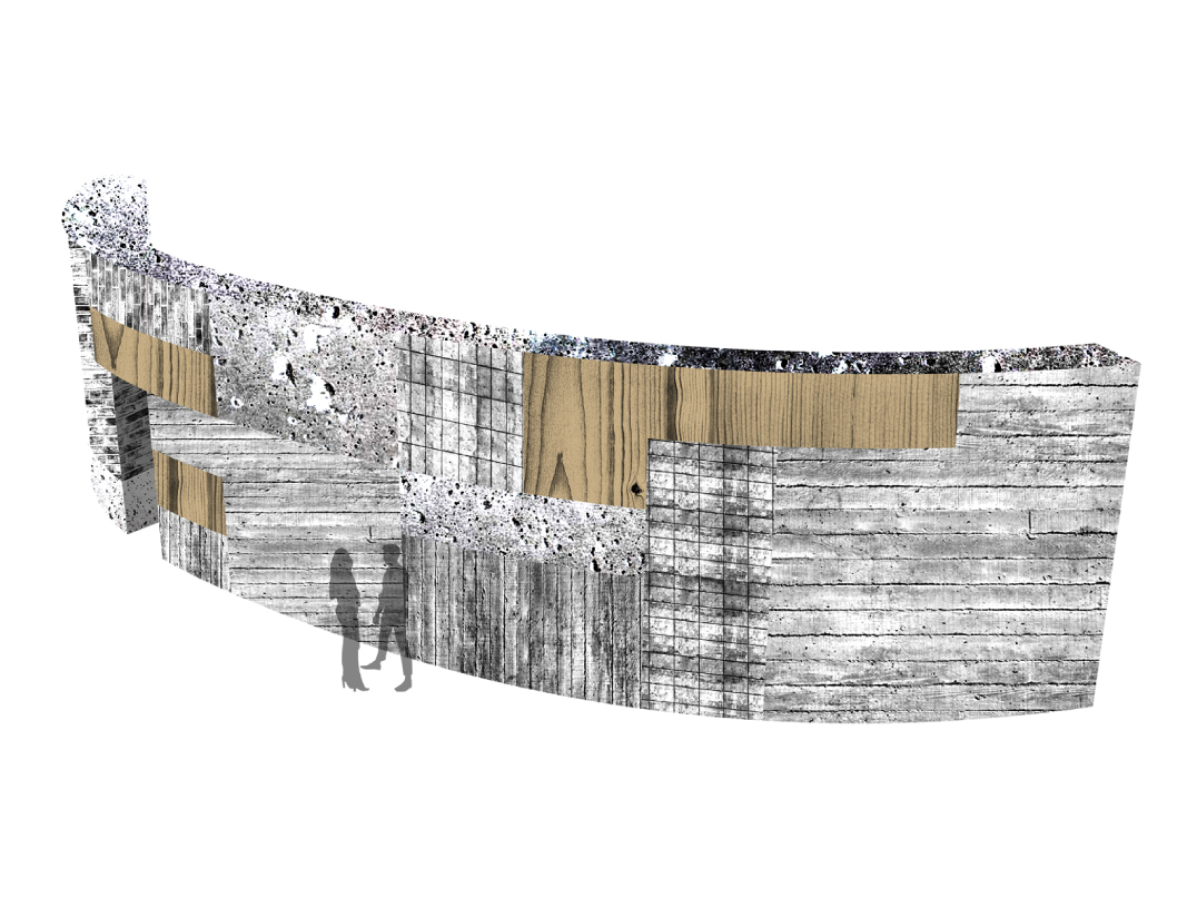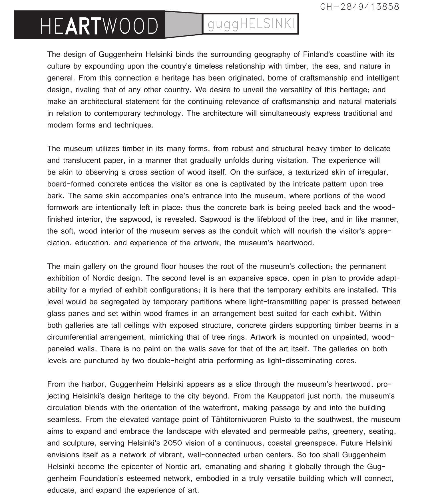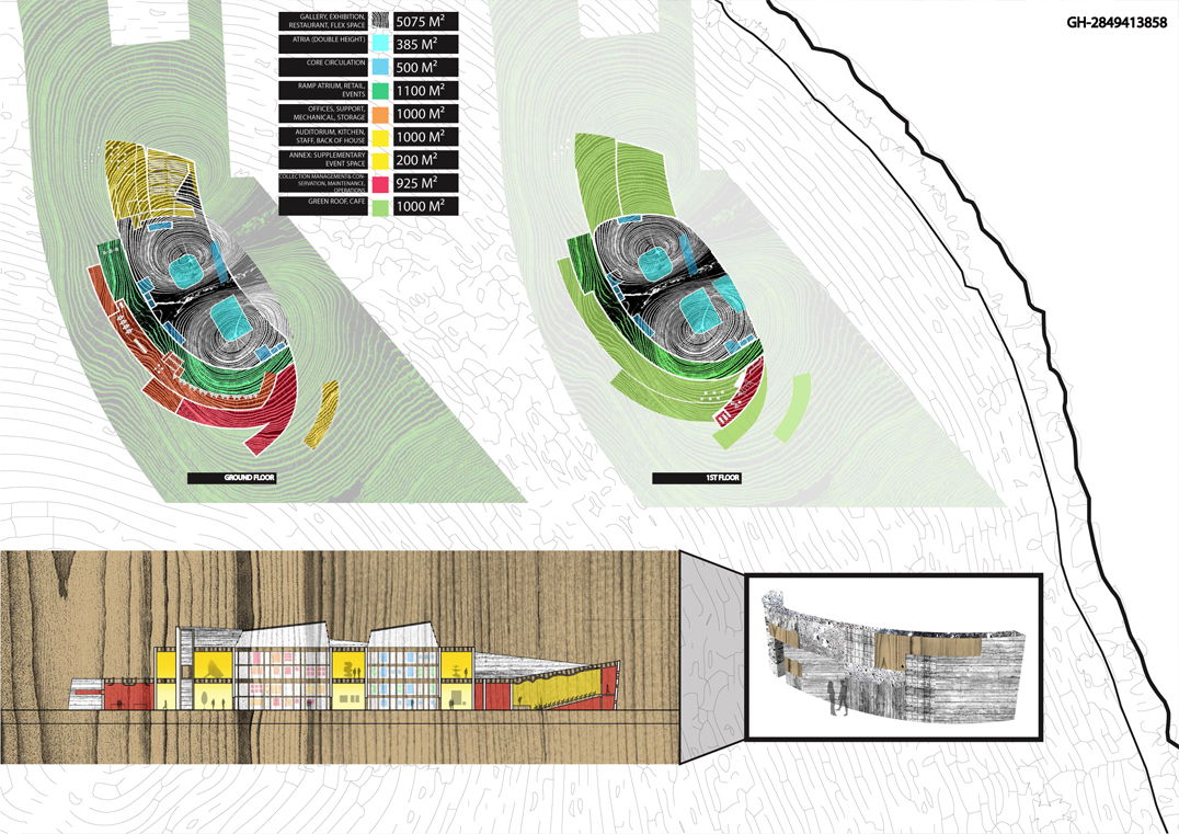 "The museum utilizes timber in its many forms, from robust and structural heavy timber to delicate and translucent paper, in a manner that gradually unfolds during visitation. The experience will be akin to observing a cross section of wood itself. On the surface, a texturized skin of irregular, board-formed concrete entices the visitor as one is captivated by the intricate pattern upon tree bark. The same skin accompanies one's entrance into the museum, where portions of the wood formwork are intentionally left in place: thus the concrete bark is being peeled back and the woodfinished interior, the sapwood, is revealed. Sapwood is the lifeblood of the tree, and in like manner, the soft, wood interior of the museum serves as the conduit which will nourish the visitor's appreciation, education, and experience of the artwork, the museum's heartwood.