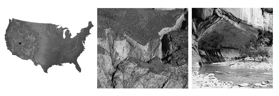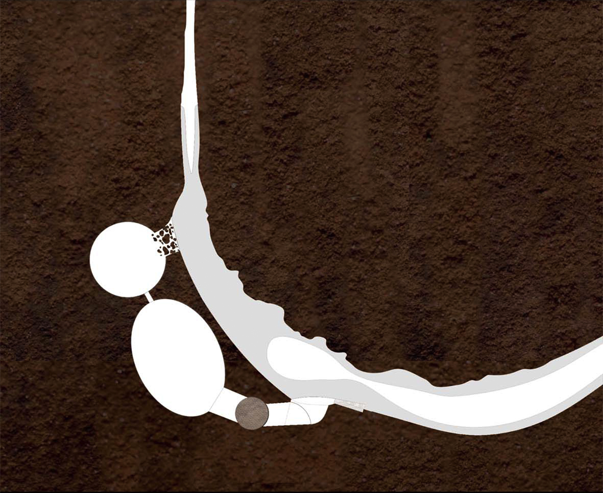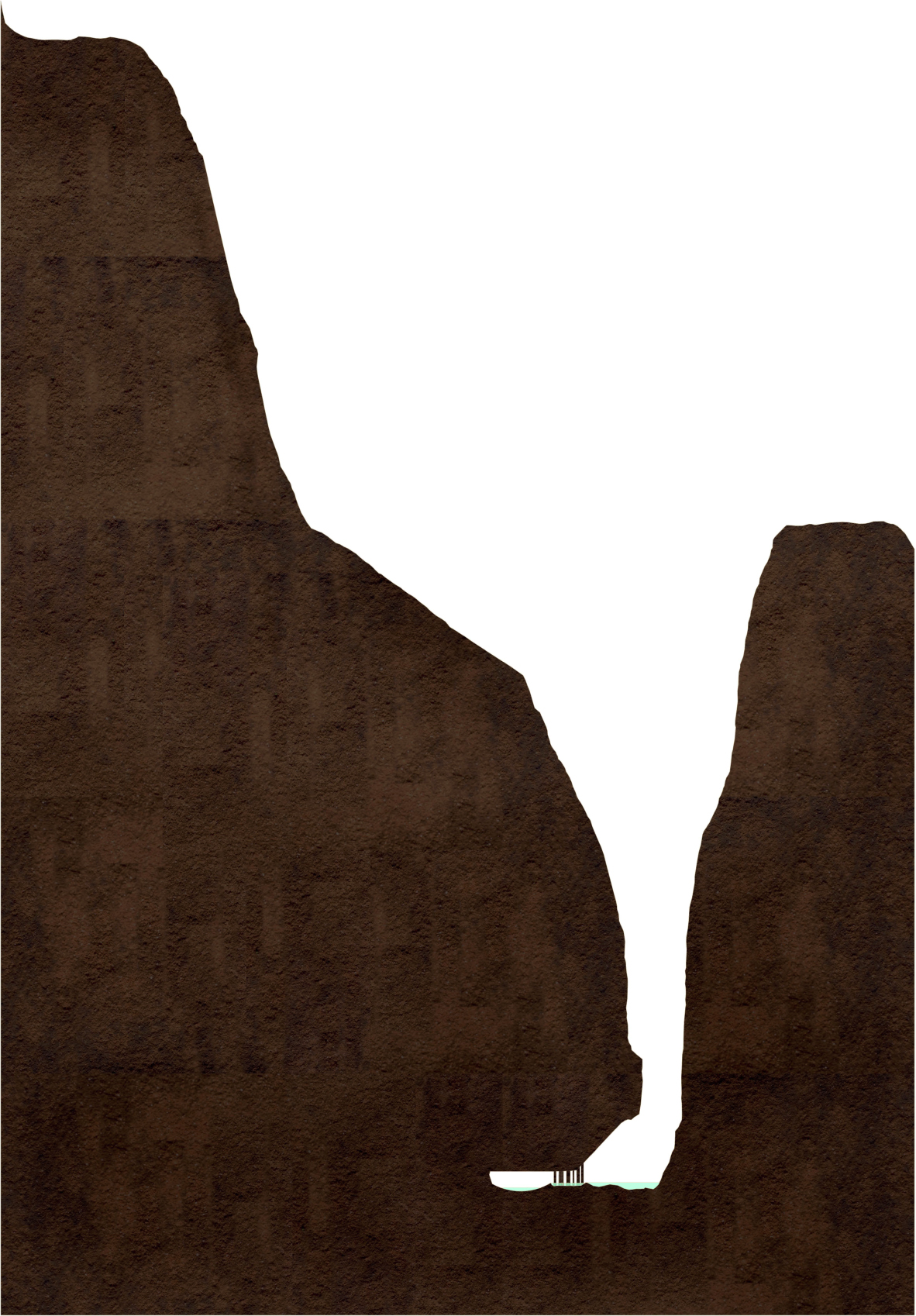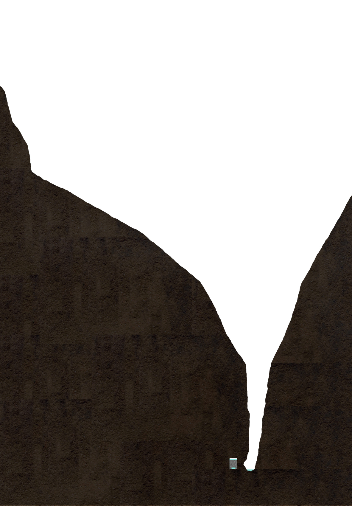 A series of caverns is carved in the canyon wall that act as water filters, depositing potable water for hikers. An architecture is generated without adding any materials, only removing them.