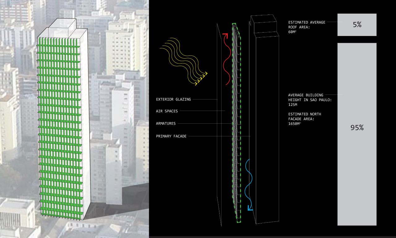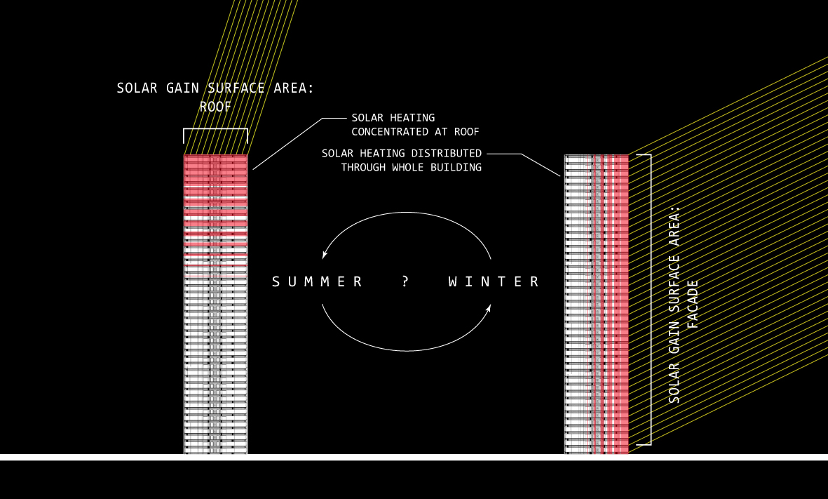 As described in my blog post of the same name, there will soon come a time when an overabundance of vertical surfaces will result in an effective inversion of the seasons, and will necessitate the mitigation of solar heat gain (the bureoning technologies of solar power, integrated vegetation, passive heating, etc.) primarily through a building's facade rather than its roof. The magnitude of such an initiative when applied to heavily-developed urban centers will be considerable.