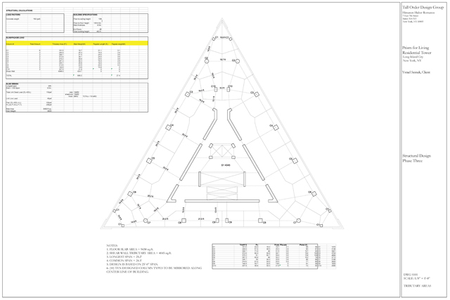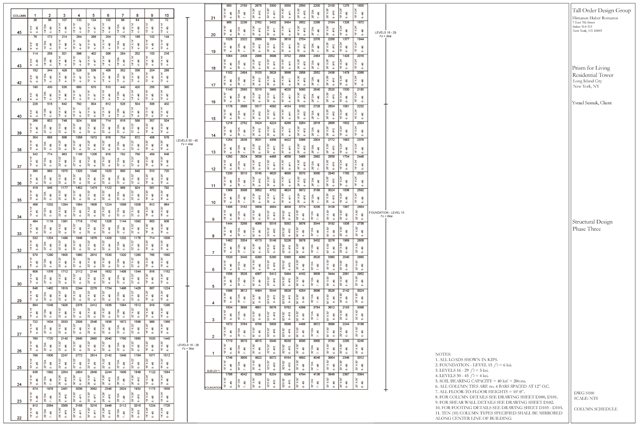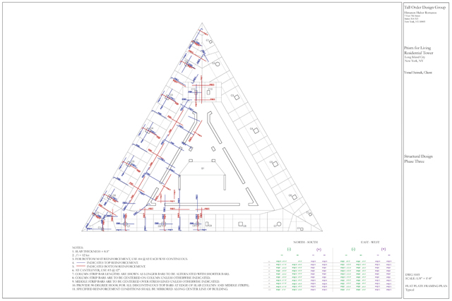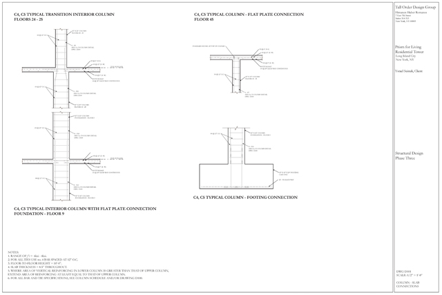 Cooper Union's comprehensive 4-year structures curriculum culminates in a semester-long project wherein a team of three designs the complete structural system for a steel-and-concrete high-rise building. All aspects and stages are accounted for, from calculating tributary areas, dead loads, and concrete strength, to preparing a column schedule, to detailing footings, flat plates, and reinforcement.