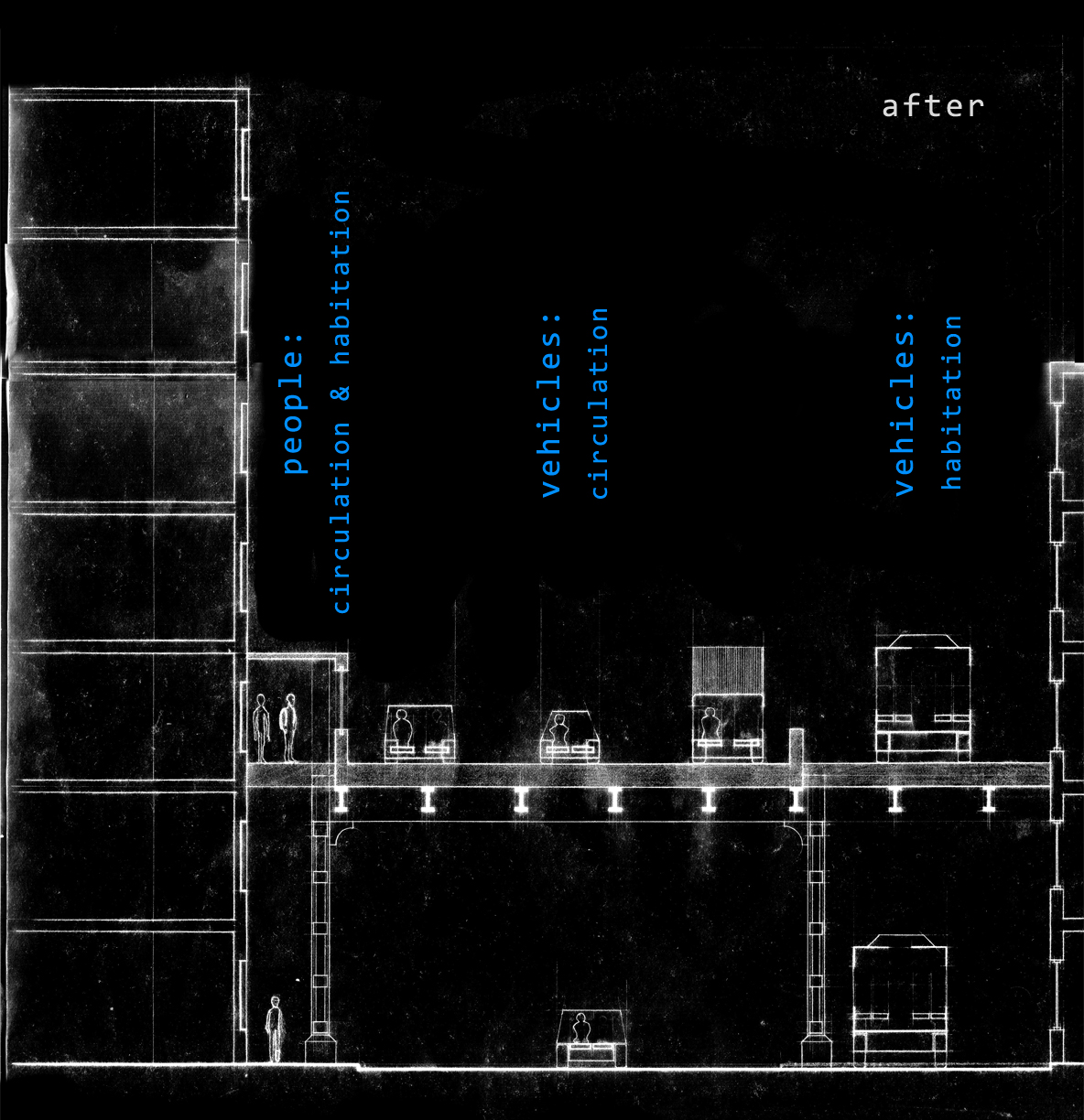 The project involved selecting a site in Manhattan with a "threshold" quality, or one with a "latency for inhabitation". This threshold would serve as a departure point for investigations into the conditions surrounding the design of a temporary inhabitation for a transient urban figure.