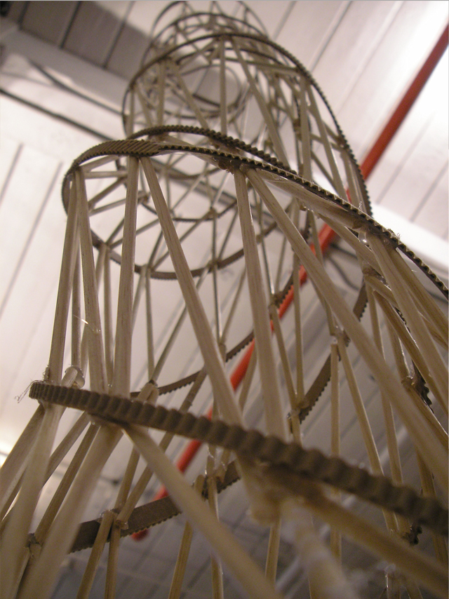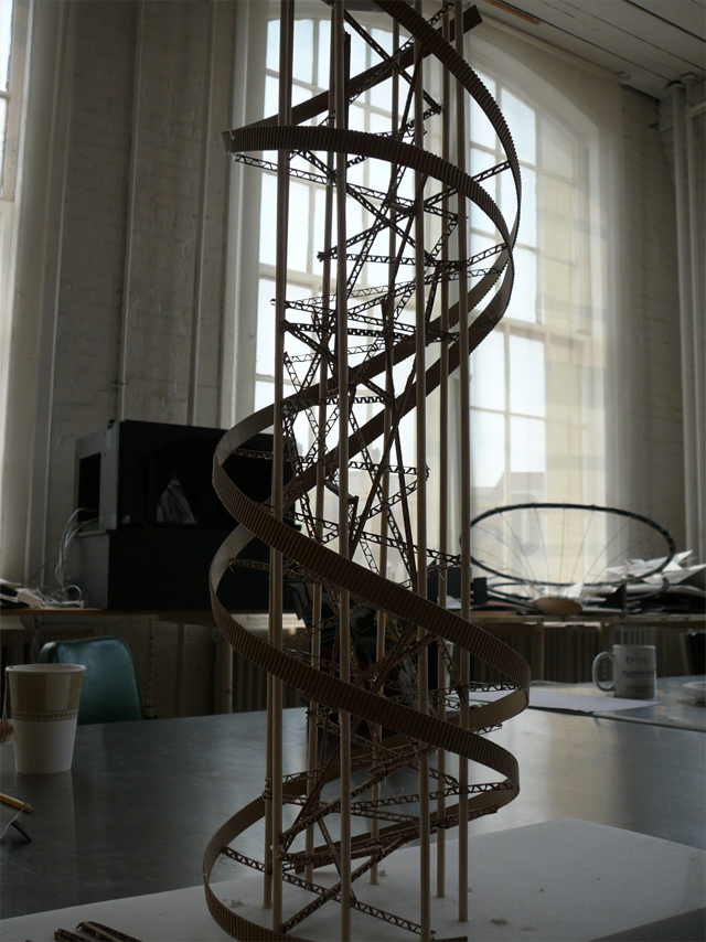 An interior truss-and-pier system supports two helixing rails that carry observation cars. Schematic and structural development happened chiefly through physical models.
