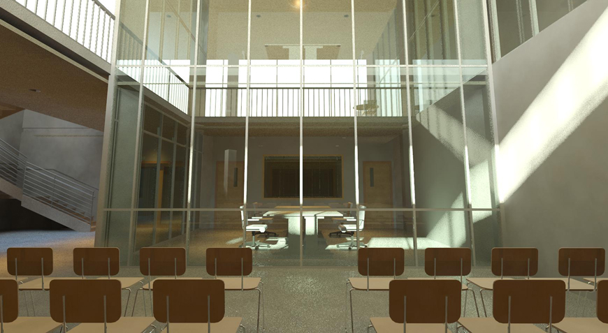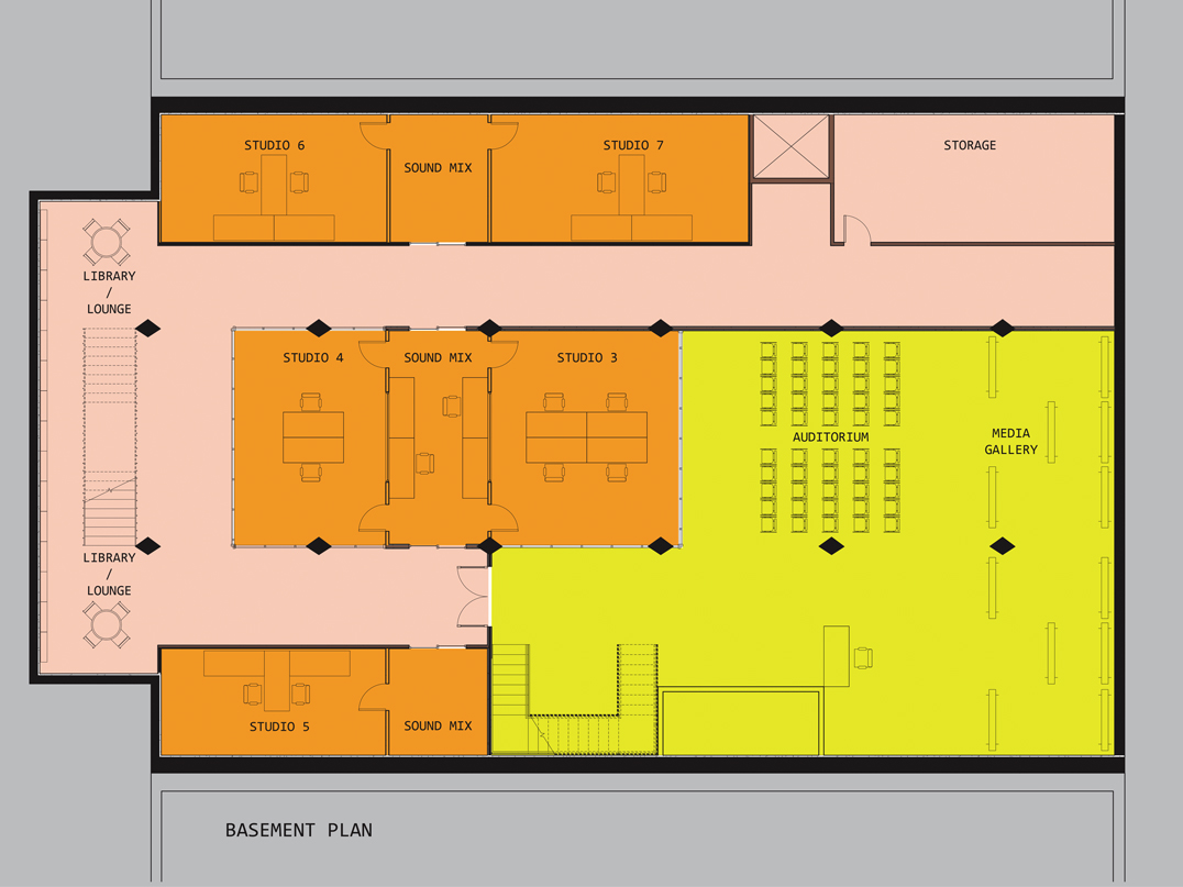 Vacant retail space at 147 West 27th Street is proposed as the location for WBAI's new studio. In keeping with the radio station's staunch dedication to transparency, open fora and the democratic process, the proposed two-story space will provide numerous soundproof broadcasting studios, an atrium, axial corridors, and provisions for the public including a media gallery and multi-purpose event space. Triple-glazing and textured paneling will ensure sound attenuation while allowing light to penetrate and play a tangible part in the exchange of information.